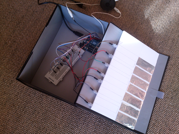 Hem muntat les tecles sobre una peça de cartó ploma de 26 x 14,5 cm que fixarem a la part de dins de la tapa per què un cop tancada la caixa quedi protegit. Això ho farem al final, per tal de poder muntar, desmuntar, connectar i arreglar el circuit amb comoditat.